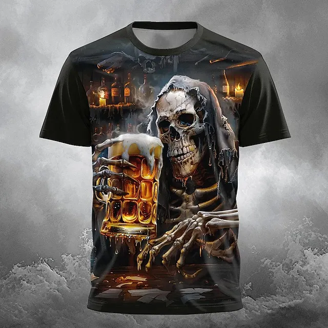 Bring gothic humor to your wardrobe with the 3D Skeleton Beer T-Shirt, where edgy art meets everyday streetwear.