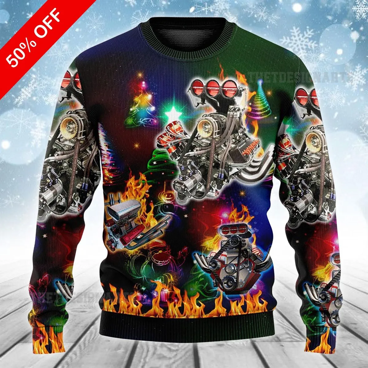 A powerful 3D Christmas sweater blending fiery car engines and festive vibes for those who live loud and love bold style.