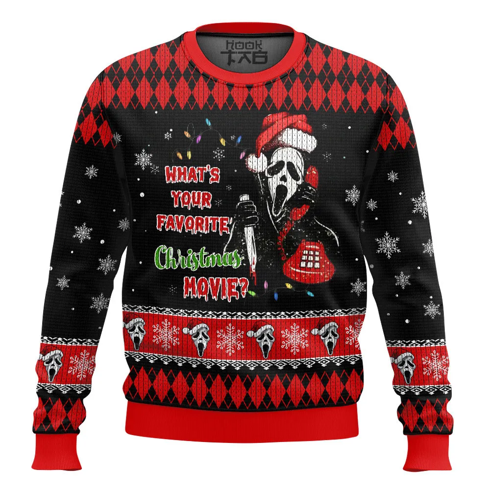 A bold black and red Christmas sweater featuring a spooky Ghostface design with the phrase “What’s Your Favorite Christmas Movie?”, blending festive cheer with horror-inspired style.