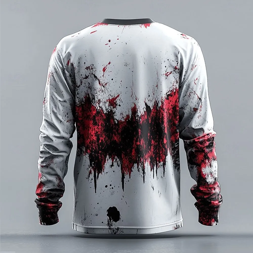 If there’s one season where fashion gets to play with the darker side of imagination, it’s Halloween—and this Halloween 3D Bloody Skull Long Sleeve Shirt is the ultimate expression of it. The shirt features a chilling skull face front and center, its wide jagged grin smeared with dripping red accents that resemble fresh blood. The hollow, blackened eyes cut through the white backdrop, while chaotic splatters of red and black spread across the sleeves and shoulders. It looks less like a simple graphic tee and more like something torn straight from a nightmare.