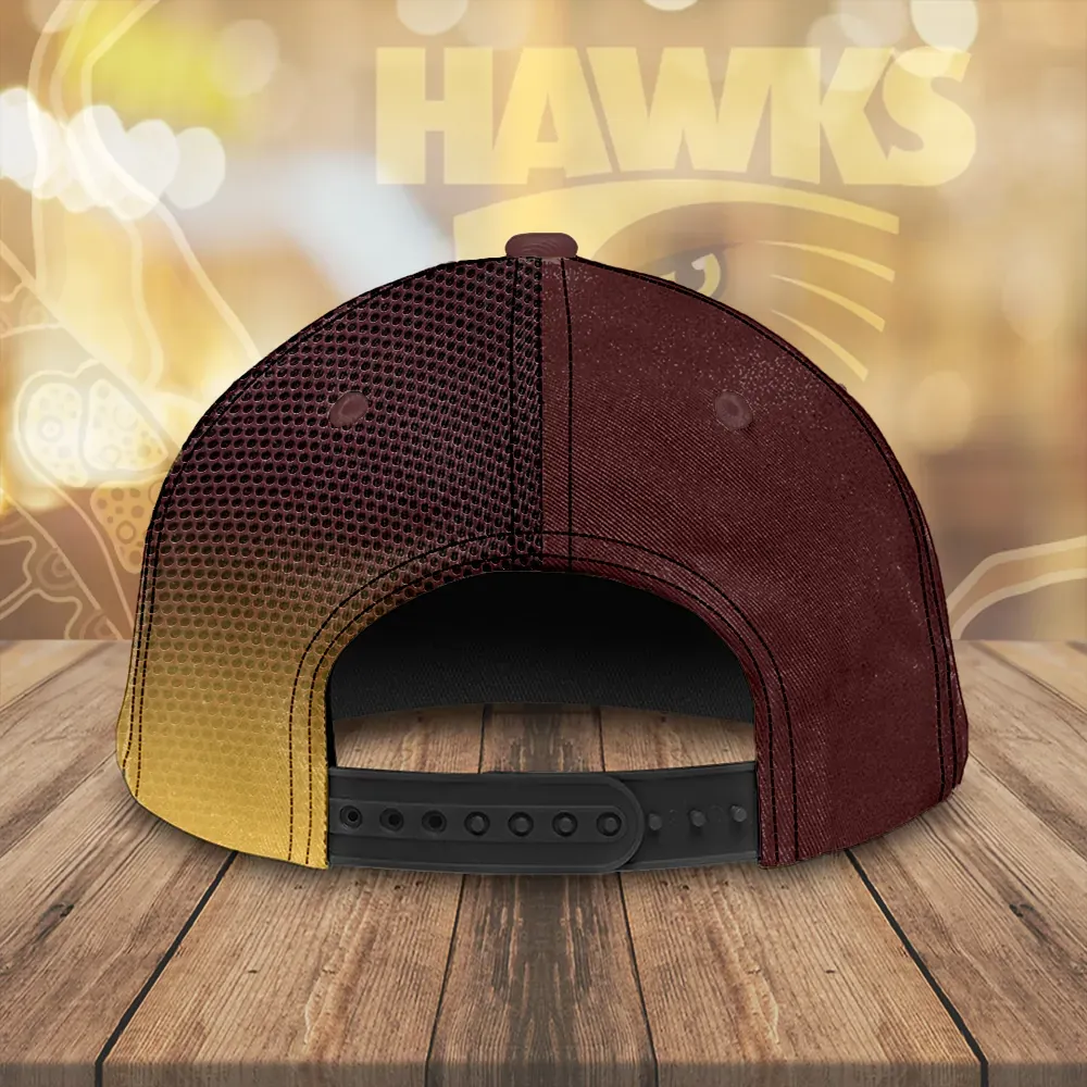 The front of the cap features two powerful visuals: the golden hawk emblem, sharply defined in a shield format, and the centenary crest, which reads HFC Hawthorn FC 100 Years. This balance of heritage and modern design creates a look that’s both stylish and symbolic. The curved brim is highlighted with flowing stripes of gold and brown, adding motion and energy to the design.