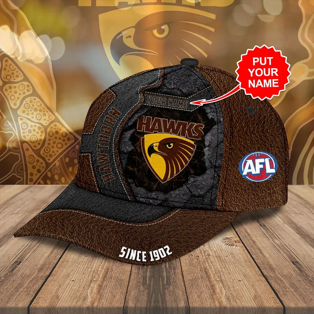 Front and center is the bold Hawthorn Hawks logo — the fierce golden hawk against a dark background, instantly commanding attention. To the left, the word “HAWTHORN” runs vertically, stitched into the design for extra identity and pride. On the visor, you’ll find the iconic “SINCE 1902”, honoring the team’s rich history and heritage.