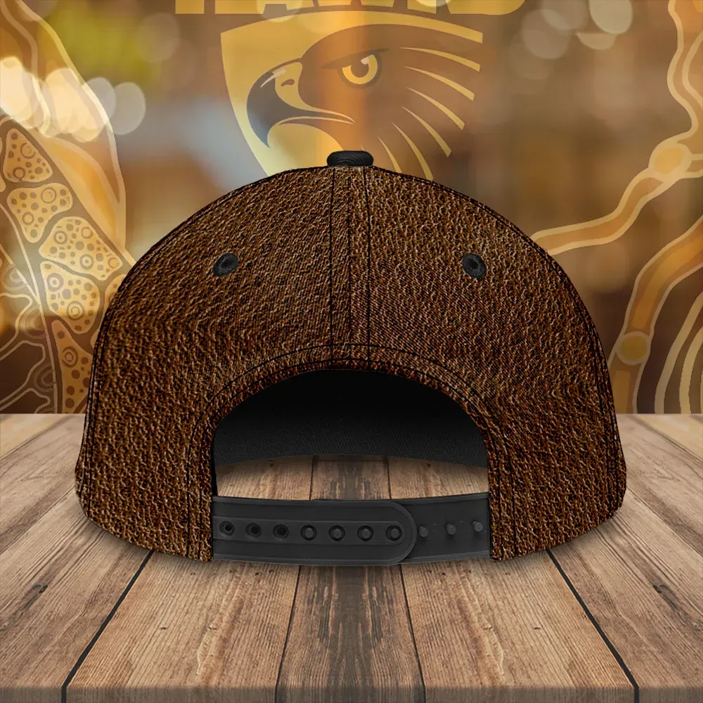 When it comes to fan gear that stands out, the Hawthorn Hawks Custom 3D Mesh Cap delivers both in style and personal touch. The first thing you notice about this cap is its dominant brown and black color palette, which creates a strong, rugged feel that perfectly matches the passion of true supporters. The cracked stone-like background texture adds depth, giving the design a gritty edge that feels powerful and authentic.