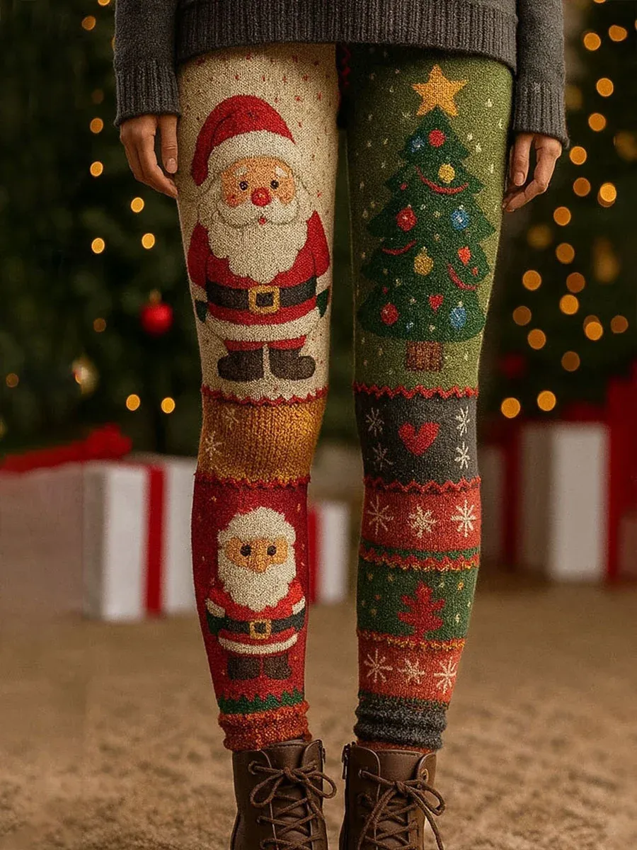 The design is a perfect balance of warm red, pine green, soft beige, and golden accents — the timeless palette of the holidays. One leg features a jolly Santa Claus, complete with rosy cheeks, a plush red suit, and his iconic belt, while the other leg showcases a beautifully decorated Christmas tree topped with a glowing star. The contrast between the deep green and vibrant red makes the pattern come alive, creating a playful yet cozy winter aesthetic.