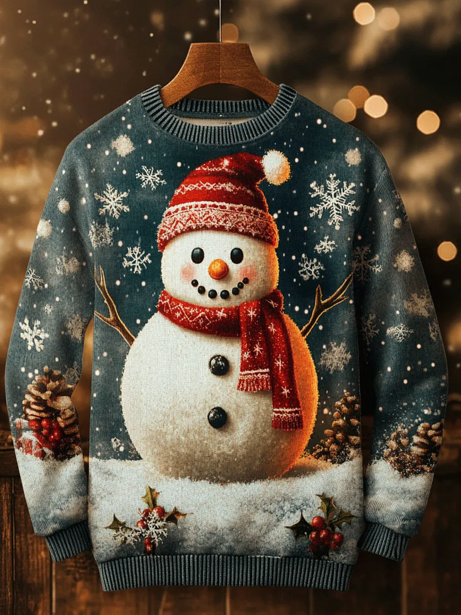 The subtle play of light and shadow in the print makes the snowman appear three-dimensional, almost glowing against the deep blue backdrop. It’s a sweater that doesn’t just keep you warm — it keeps your holiday spirit glowing. The ribbed cuffs and neckline add a classic finish, making it ideal for both casual gatherings and festive events.