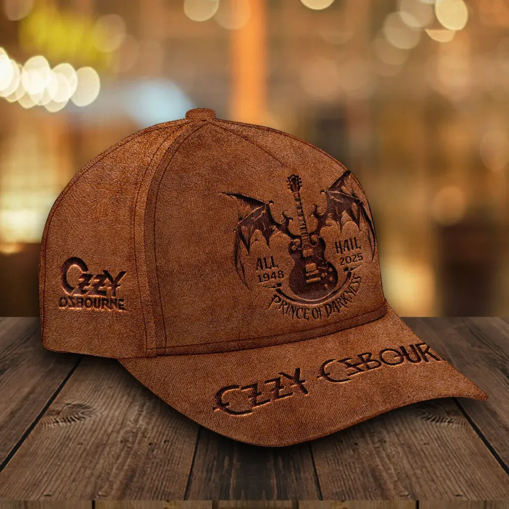 At the center of the design, a dark electric guitar rises like a monument, flanked by two gothic bat wings. Above the guitar, the words “All Hail 1948 – 2025” are inscribed, solidifying the cap as a tribute to Ozzy’s immortal legacy. Beneath, the phrase “Prince of Darkness” curves boldly, tying the artwork together with a touch of haunting elegance.