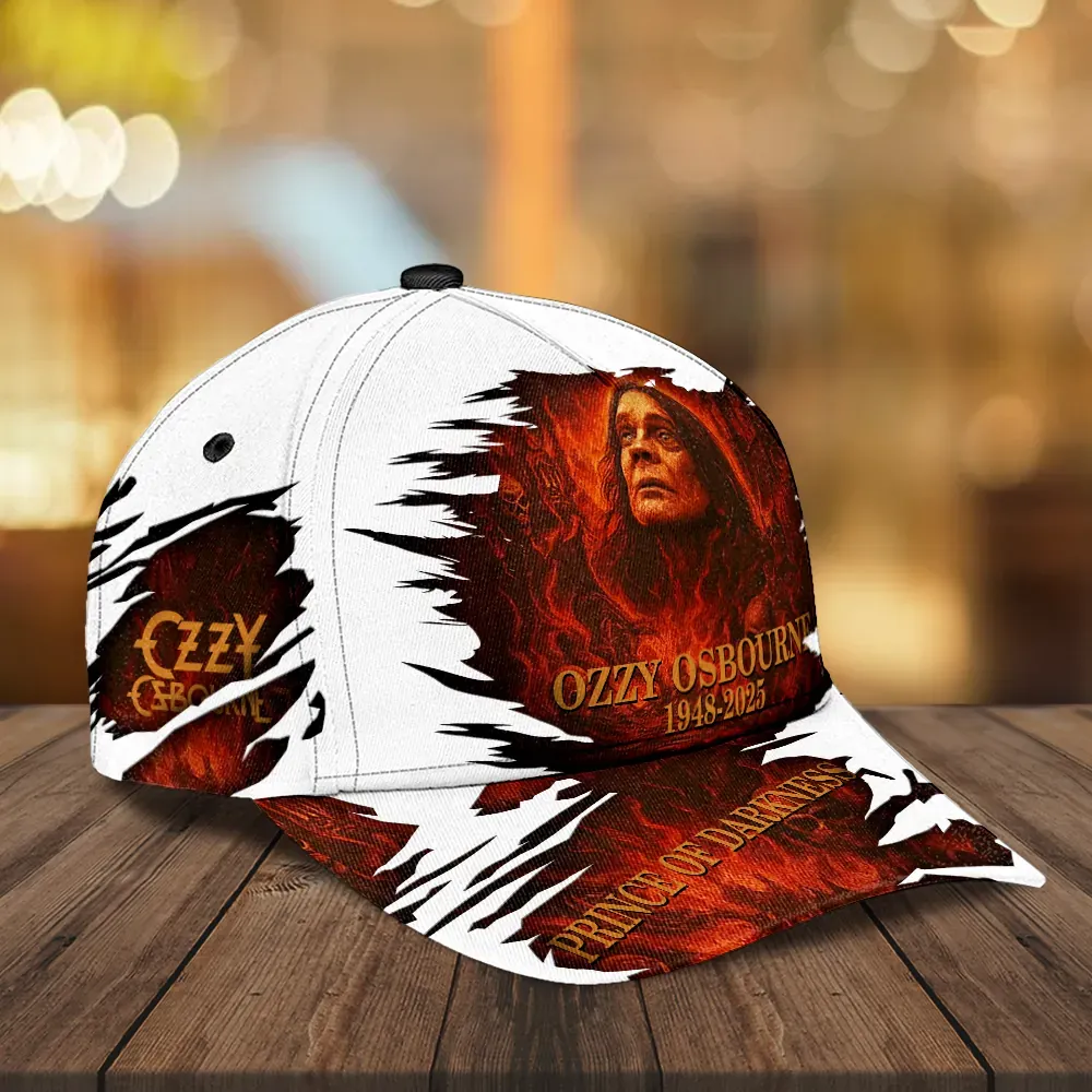 The text “OZZY OSBOURNE 1948–2025” is displayed in a regal gold font, commanding attention and anchoring the cap’s tribute design. Across the brim, the words “PRINCE OF DARKNESS” appear in the same golden hue, seamlessly blending with the fiery background. Together, these details create a visual rhythm that balances chaos with reverence.
