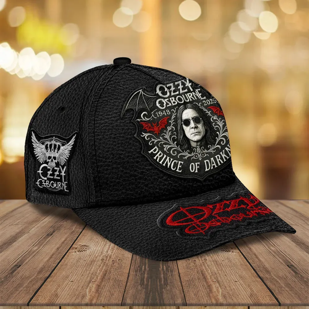 A striking 3D tribute cap in bold black and red tones, honoring Ozzy Osbourne as the Prince of Darkness.
