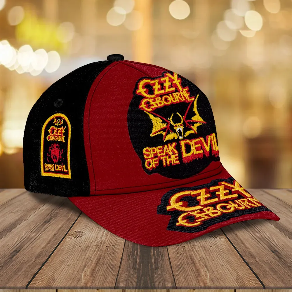 Front and center, the cap showcases a striking embroidered bat with spread wings, highlighted in yellow and outlined in red, giving the graphic a fiery glow. Just beneath, the iconic phrase “SPEAK OF THE DEVIL” is stitched in blazing red-and-yellow gradient lettering, a nod to one of Ozzy’s most unforgettable eras. Above it, Ozzy Osbourne’s name appears in jagged gothic script, evoking the sharp energy of his heavy metal sound.