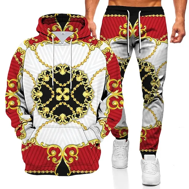 Turn heads with the Red Black Gold Chain 3D Hoodie & Jogger Set – a bold streetwear statement in red, black, white, and gold.