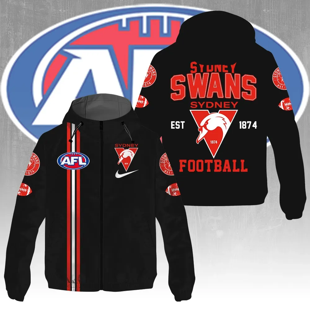 A powerful black windbreaker accented with red-and-white Sydney Swans 3D graphics for AFL fans who want to stand out.